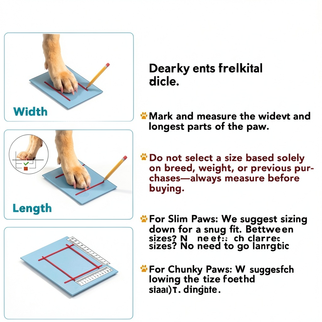 Measure your dog’s paw width and length using the provided guidelines, as sizing is based on paw dimensions rather than breed or weight. This ensures a snug and comfortable fit.